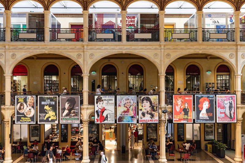 C’è un momento preciso, entrando in Biblioteca Salaborsa, in cui ci si accorge della novità. Quando levando lo sguardo si scoprono i grandi manifesti cinematografici appesi lungo il ballatoio del primo piano.